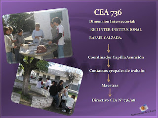 En el año 2007 integramos la red Rafael Calzada constituida por diversos sectores del ámbito socio-comunitario: centro de salud- servicio local de P. P.-instituciones comunitarias como clubes, comedores y O.N.G. Con el objetivo de potenciar los recursos existentes y emprender acciones organizadas y dirigidas tomamos contacto con el coordinador de la Capilla Asunción. El predio donde funciona la capilla comparte las instalaciones con el comedor municipal, Cilsa que es una organización no gubernamental que ofrece apoyo escolar y un CENTRO EDUCATIVO DE ADULTOS.