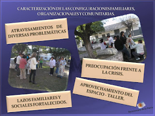 Hemos observado que los grupos familiares, comunitarios y organizacionales se encuentran atravesados por problemáticas sociales como drogadependencia, violencia, delincuencia, que afectan la funcionalidad de los mismos. Sin embargo, detectamos en los participantes claridad en el desenvolvimiento de roles tanto de adultos como de adolescentes.